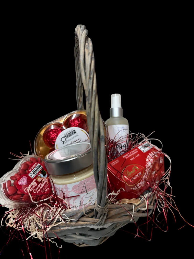 Chandelle aphrodisiac, chocolat, bonbon et bruine d'ambiance à la lavande, le tout dans un panier avec emballage célophane.