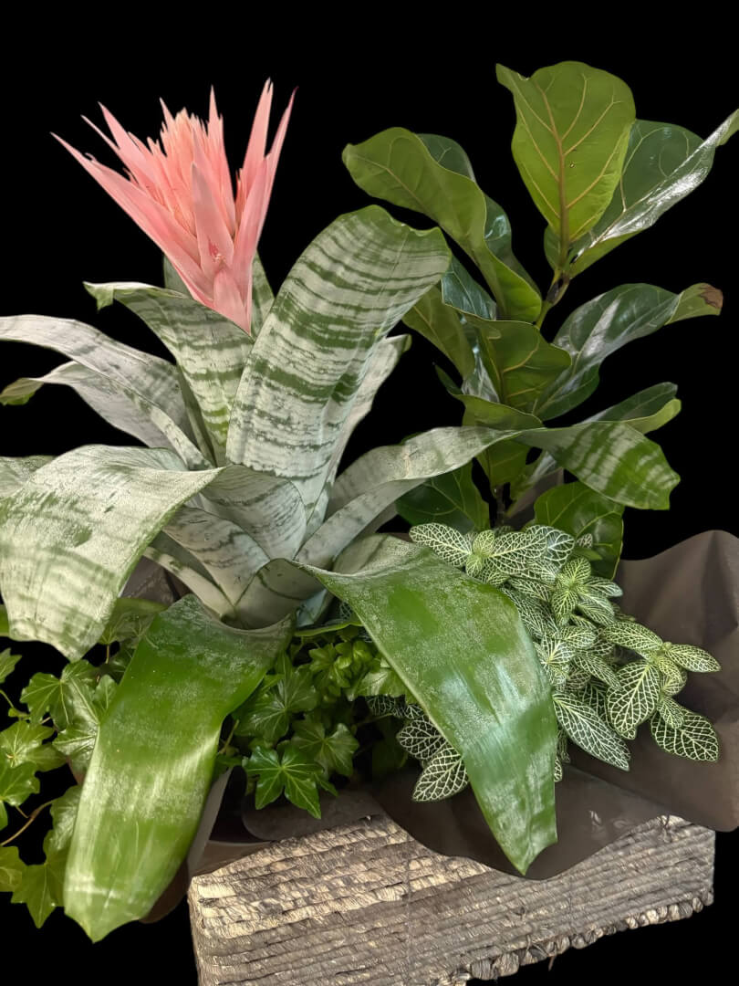 Aechméa, ficus,Fittonia, lierre avec panier, facile d'entretien.
